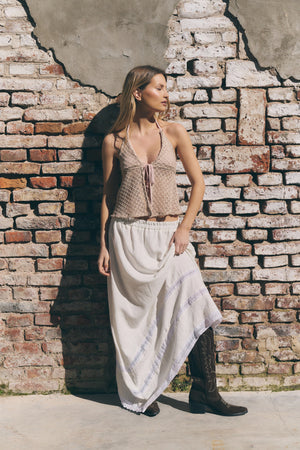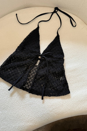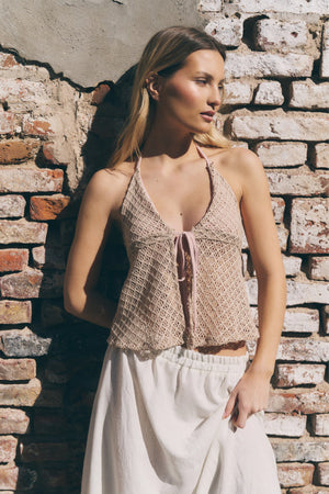 Top confeccionado en tejido liviano y calado, de textura artesanal y fresca. Presenta escote halter profundo con breteles finos y lazo central para ajustar, aportando un detalle femenino y delicado. Su diseño abierto en el delantero y caída suelta brindan comodidad y un aire relajado, ideal para los días cálidos o looks de playa con estilo bohemio.