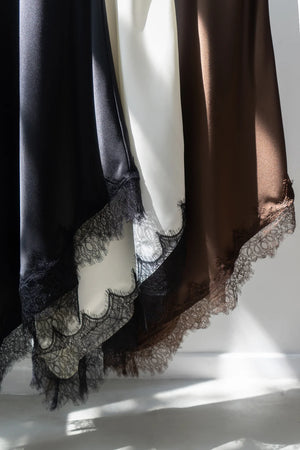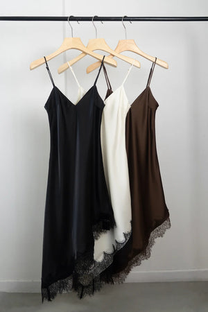 Vestido largo de seda, terminación asimetrica con encaje en la parte inferior. Tiene breteles regulables y pinzas que hacen que el calce sea perfecto. Disponible en talle S y M.